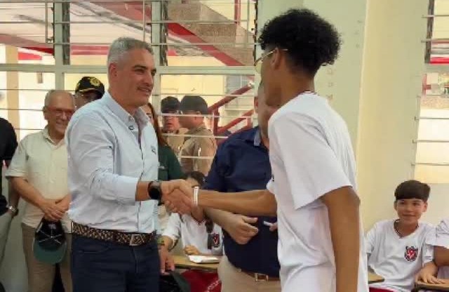 Acompañamos la entrega de kits escolares y uniformes de educación física a estudiantes de primaria de colegios públicos en Copacabana.